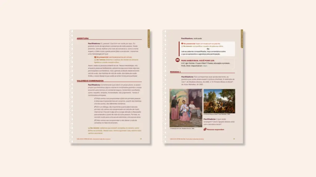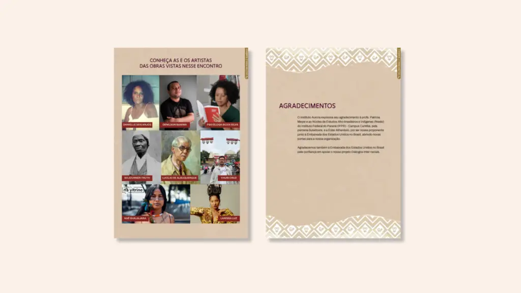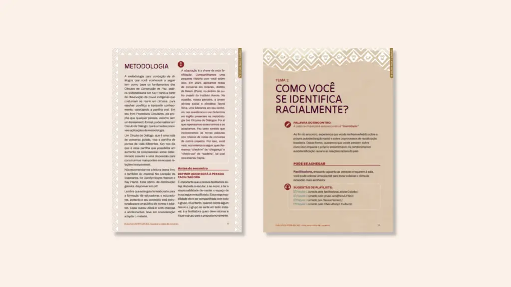 Material educativo organizado pelo Instituto Aurora, voltado para a facilitação de diálogos sobre relações inter-raciais no Brasil. Diagramação e ilustrações feitas por Kath Xapi Puri.